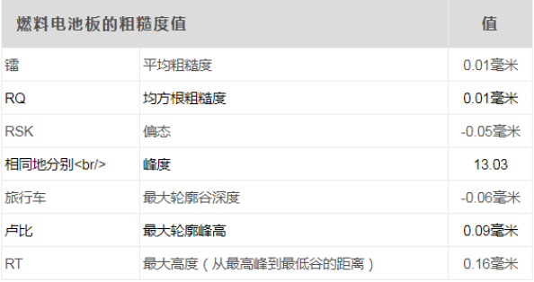 粗糙度 高精度非接触式粗糙度测量 诺飞勘计量系统提供快速可靠的表面粗糙度参数非接触式3D表面测量。他们提供: · 精度优于1μm · 能够使用相同的系统来测量2D粗糙度( Ra,Rq,Rsk,Rku,Rv等),3D粗糙度, 形状(GD&T参数),平坦度,波纹度和/或缺陷 取决于其配置 · 高速扫描:每秒采集2,100到100,000个3D点 · 制造或涂层工艺的实时反馈:应用数据通常被转发到过程控制软件 · 简单的视觉检查:3D表面贴图,高度和强度图像,深度剖面等。 燃料电池板的样品粗糙度测量参数(右侧的高度图像)如下所示。