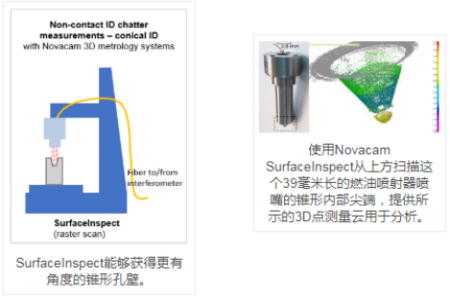 测量CONICAL孔内的震颤 虽然BoreInspect或TubeInspect可以获取锥形ID,但对于某些应用程序,诺飞勘的SurfaceInspect (参见图表)可能更合适。 SurfaceInspect使用振镜(光栅)扫描仪获取表面,该扫描仪可以定位在孔上方,以非常快速,非接触的方式获得孔ID锥形表面。以这种方式获得的3D点云不仅可用于计算锥形表面的震颤,还可用于计算锥形表面的各种GD&T参数。 |