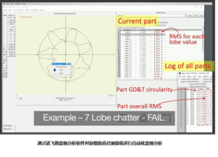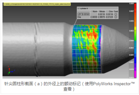 测量OD上的震颤 可以使用诺飞勘SurfaceInspect或TubeInspect系统测量圆柱形或圆锥形零件外径的震颤。 例如,TubeInspect用于测量燃油喷射器喷嘴针尖的外径(见照片和图表)。 在发动机工作期间,当喷嘴针被推到喷嘴内的最深位置时,其尖端必须与喷嘴座形成密封,以确保燃料朝喷嘴喷射孔施加足够的压力。因此,针的几何形状和表面光洁度对注射器效率至关重要。 在测量的样本上,圆柱形部分和针尖的锥形部分上都检测到颤动标记。在这种情况下,锥形部分更为重要。 震颤分析软件 诺飞勘震颤分析软件可用于分析3D表面测量数据,并根据用户标准将零件分类为PASS或FAIL。通过数学方法分析震颤模式,并通过诸如每个波瓣值的幅度或RMS(均方根)值之类的值来表征。